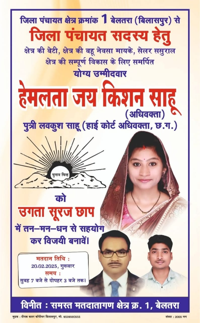 बिलासपुर । जिला पंचायत सदस्य क्षेत्र क्रमांक एक बिल्हा (बेलतरा ) के लिए अब से कुछ घंटे बाद मतदान शुरू हो जाएगा । प्रचार के अंतिम दौर में उगता सूरज चुनाव चिन्ह पर लड़ रही युवा प्रत्याशी अधिवक्ता हेमलता साहू सब पर भारी पड़ती दिख रही है ।