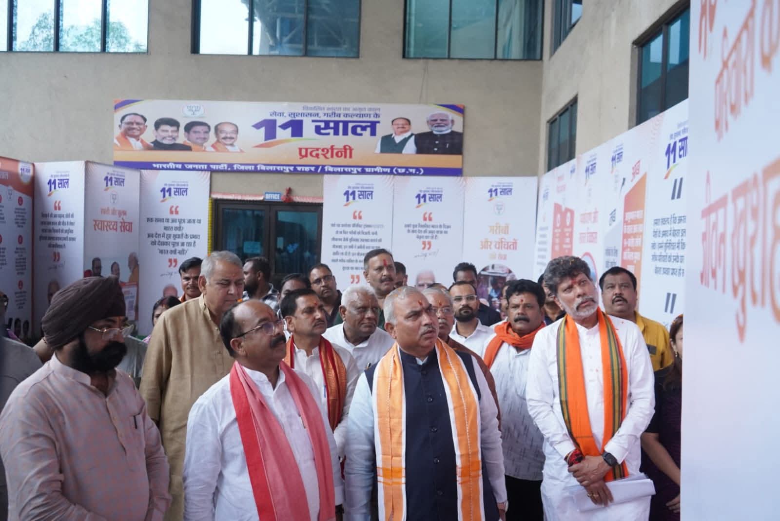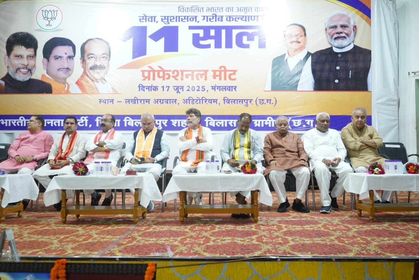 *बिलासपुर।* केंद्र की नरेंद्र मोदी सरकार के नेतृत्व में 11 साल पूरे होने पर आज लखीराम ऑडिटोरियम में प्रोफेशनल मीट का आयोजन किया गया। संकल्प से सिद्धि अमृत काल और मोदी सरकार के 11 साल के इस प्रोफेशनल मीट पर शहर के विभिन्न सामाजिक संगठन डॉक्टर इंजीनियर,वकील, आध्यात्मिक और व्यवसाय जगत से जुड़े लोगों के साथ भाजपा के संगठन पदाधिकारी कार्यकर्ता मौजूद थे। प्रोफेशनल मीट में भाजपा के राष्ट्रीय सह संगठन महामंत्री मंत्री शिवप्रकाश, भाजपा के प्रदेश संगठन मंत्री पवन साय, केंद्रीय राज्य मंत्री तोखन साहू भाजपा के प्रदेश अध्यक्ष किरण सिंह देव सिंह, डिप्टी सीएम अरुण साव, विधायक अमर अग्रवाल, धरमलाल कौशिक धर्मजीत सिंह, पुन्नू लाल मोहले, रजनीश सिंह भूपेंद्र सवन्नी भाजपा के जिला अध्यक्ष दीपक सिंह मोहित जायसवाल आदि उपस्थित थे।