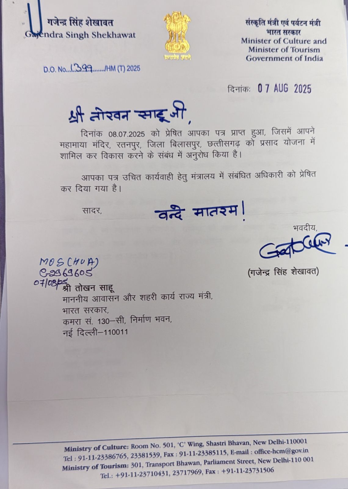 श्री शेखावत ने 07 अगस्त 2025 को भेजे पत्र में सूचित किया कि तोखन साहू का अनुरोध मंत्रालय में संबंधित अधिकारी को उचित कार्यवाही हेतु प्रेषित कर दिया गया है। यह पहल महामाया मंदिर परिसर के धार्मिक, सांस्कृतिक एवं पर्यटन विकास को नई दिशा प्रदान करेगी।