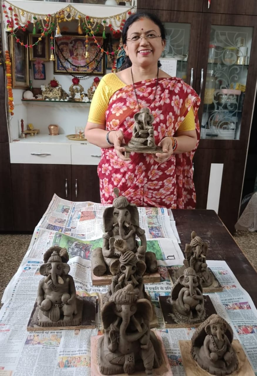 बिलासपुर । डॉ रश्मि ने मिट्टी से बनाई श्री गणेश जी की मूर्ति।विकास नगर बाजपेयी चैंबर निवासी डॉ रश्मि चन्द्र शेखर बाजपेयी ने घर पर ही मिट्टी से गणेश जी की प्रतिमा का निर्माण किया,डॉ रश्मि जंगल मितान व नारीशक्ति की वरिष्ठ सदस्य हैं,उनका कहना हैं कि हम घर पर बैठने वाले गणेश जी की मूर्ति का निर्माण पर्यावरण को देखते हुए मिट्टी से करें, विसर्जन भी घर पर गमले में करें,उस पर एक पौधा लगावे अपने पर्यावरण को सुरक्षित रखें,कृपया पन्नी का उपयोग बंद करें अपने पुराने कपड़ों से सिले थैले का उपयोग करें, अधिक से अधिक पौधारोपण करें व उसे सुरक्षित रखें,पूजा में उपयोग होने वाली सामग्री को नदी नाले तलब में विसर्जित न करें,गमले में डाल कर खाद बनाएं व उसका उपयोग पेड़ पौधों में करें, पर्यावरण को सुरक्षित रखने में सहयोग करें,,,,