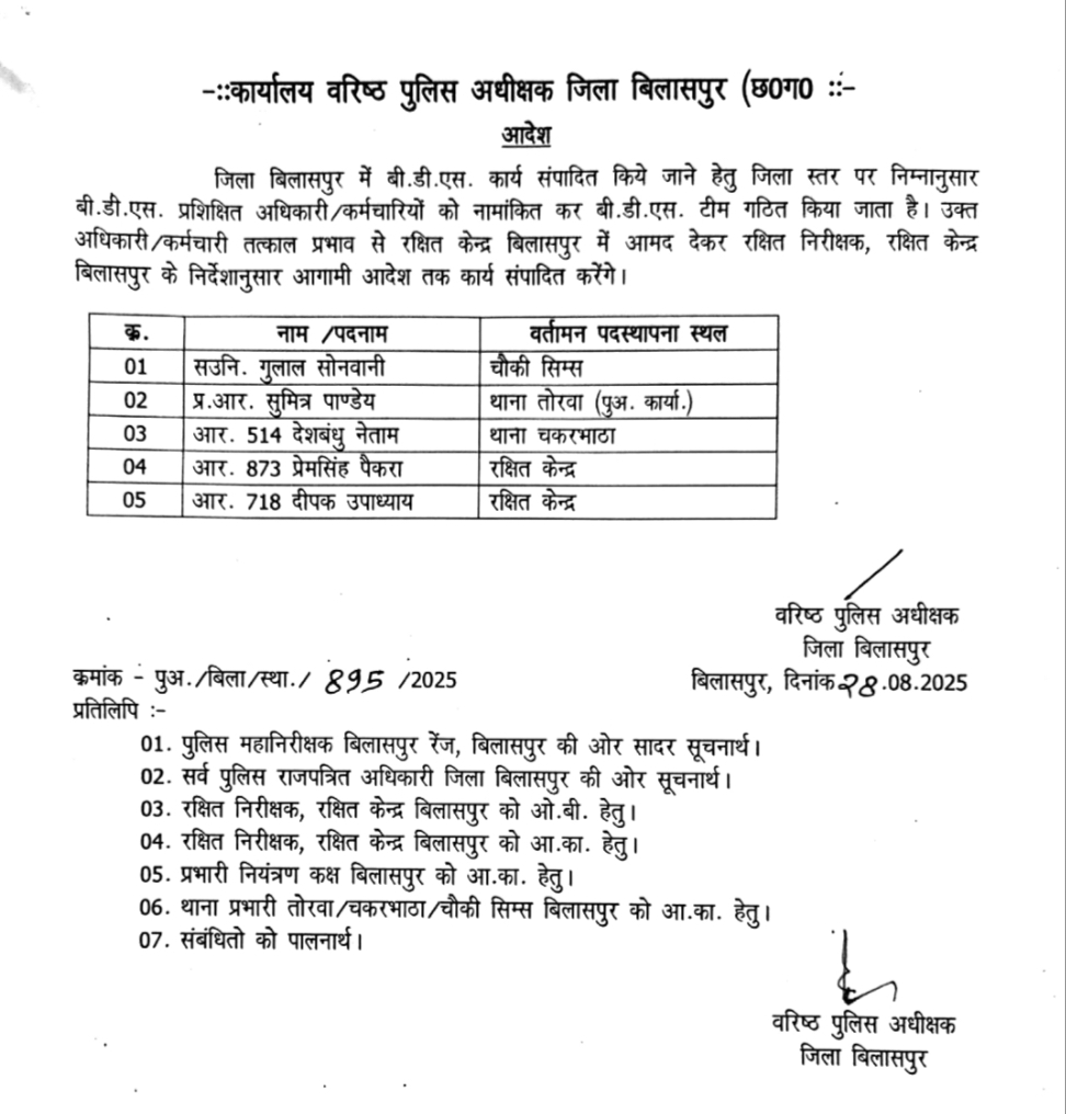 बिलासपुर । पिछले चार साल से एक ही स्थान सिम्स पुलिस चौकी में पदस्थ प्रभारी सोनवानी को एसएसपी ने हटा दिया है । उन्हें बम निरोधक स्क्वायड में भेजा गया है।