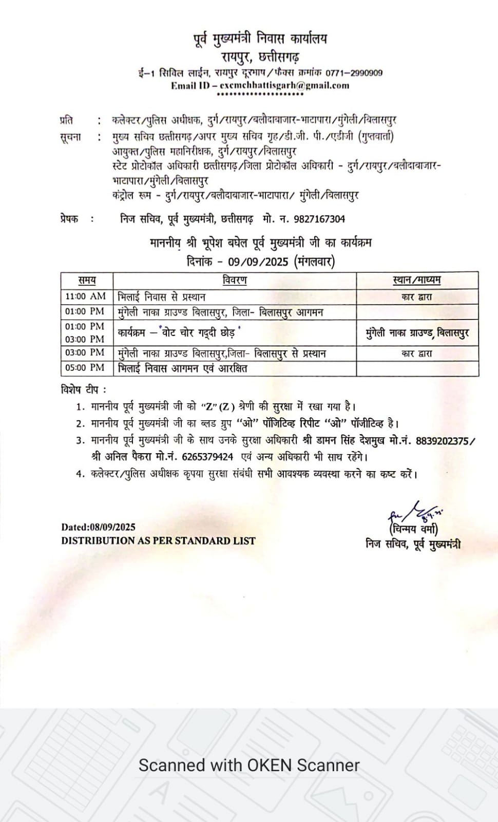 बिलासपुर – प्रदेश कांग्रेस द्वारा बिलासपुर में आयोजित ‘‘वोट चोर गद्दी छोड़’’ जनसंभा में शामिल होने प्रदेश के पूर्व मुख्यमंत्री अखिल भारतीय कांग्रेस कमेंटी महासचिव भूपेश बघेल 09 सितंबर को बिलासपुर पहुंचेंगे। पूर्व मुख्यमंत्री के निवास से जारी कार्यक्रम के अनुसार सुबह 11 बजे भिलाई निवास से प्रस्थान कर दोपहर 01 बजे मुंगेली नाका ग्राउंड बिलासपुर पहुंचेंगे। दोपहर 01 से 03 बजे कार्यक्रम में शाामिल होने के बाद कार्यक्रम स्थल से भिलाई के लिए प्रस्थान करेंगे। उक्त जानकारी अरपा विकास प्राधिकरण के पूर्व उपाध्यक्ष प्रदेश प्रवक्ता अभयनारायण ने दी।