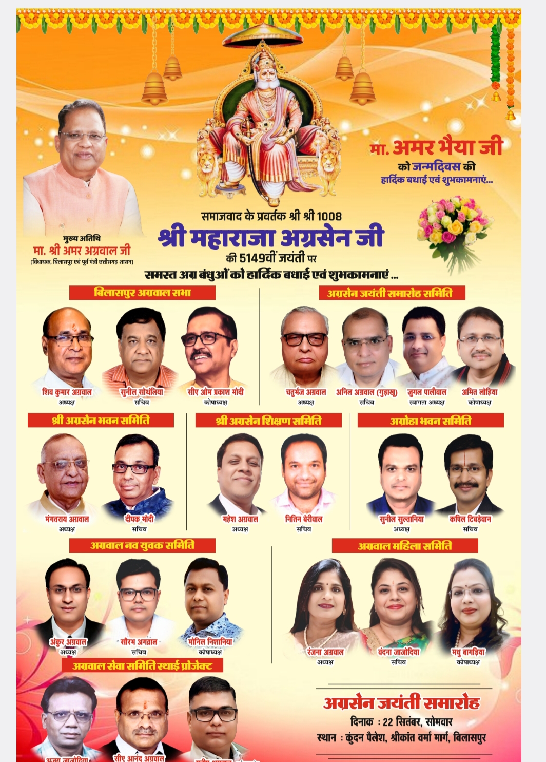 बिलासपुर। 22 सितंबर सोमवार को भंडारा एवं अग्रसेन जयंती का मुख्य कार्यक्रम कुंदन पैलेस में मुख्य अतिथि विधायक अमर अग्रवाल शामिल होंगे।