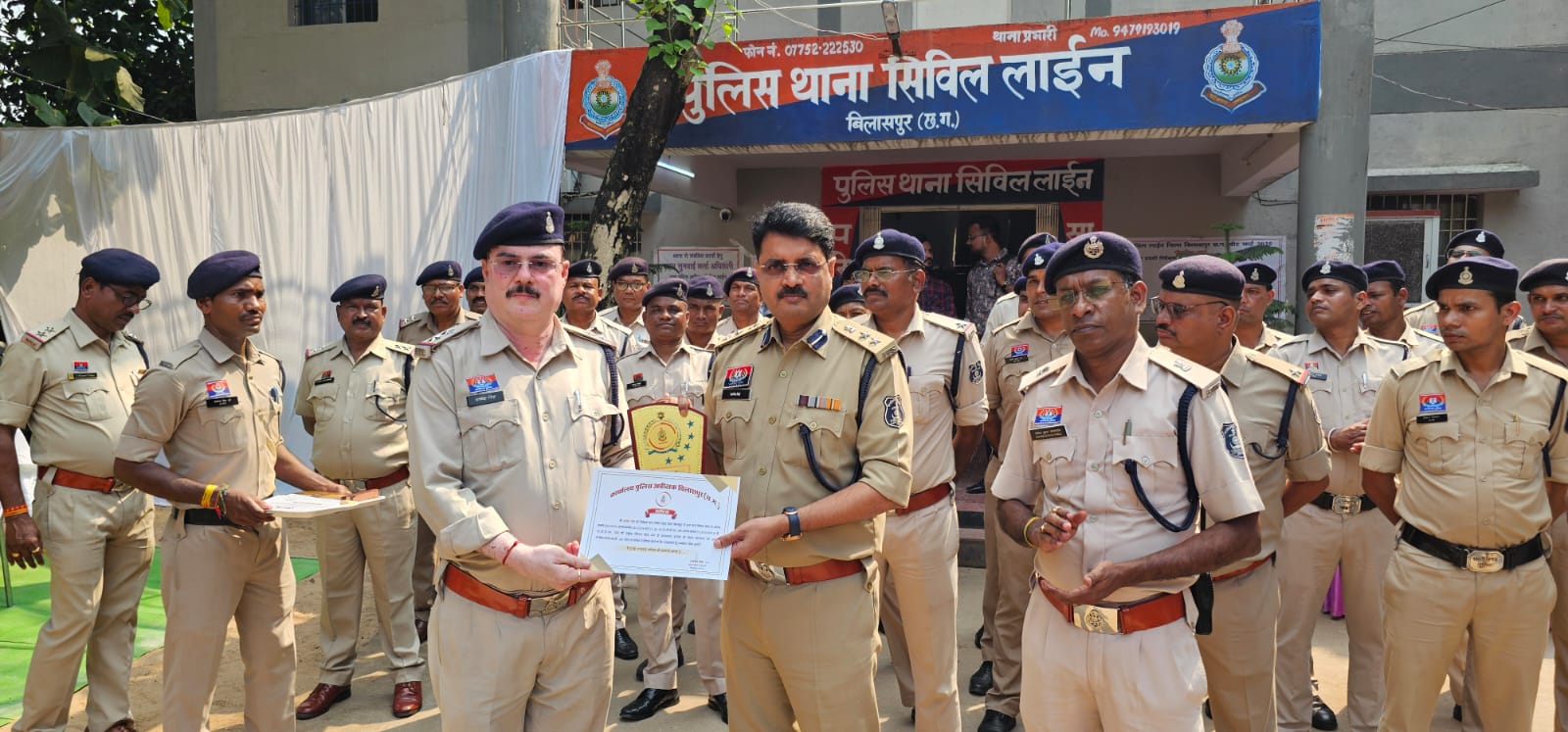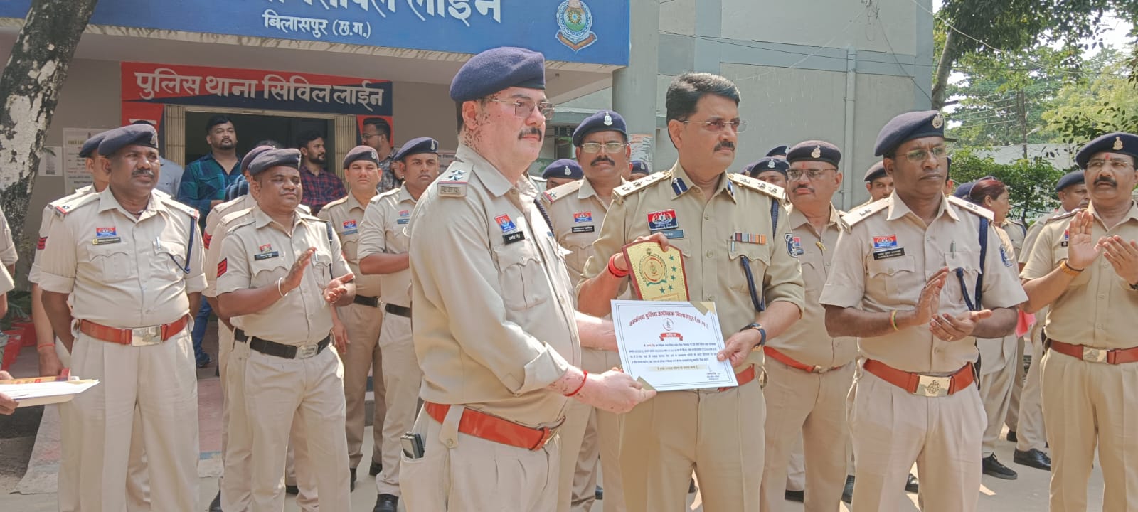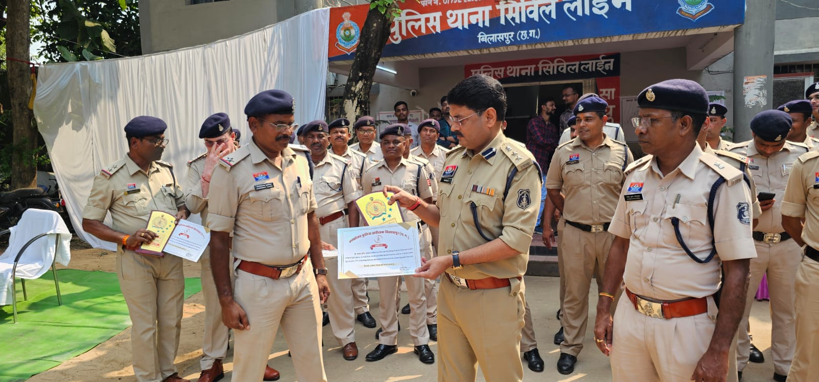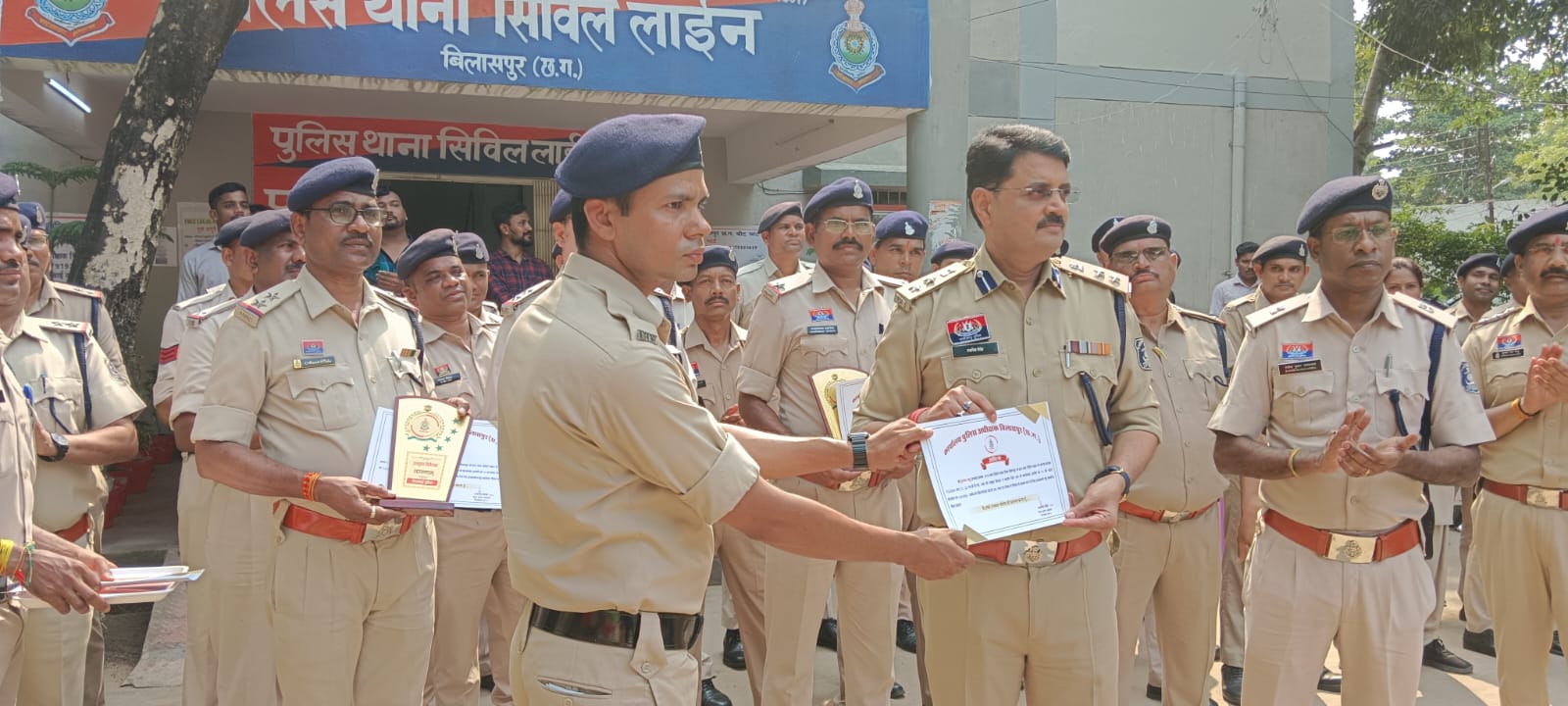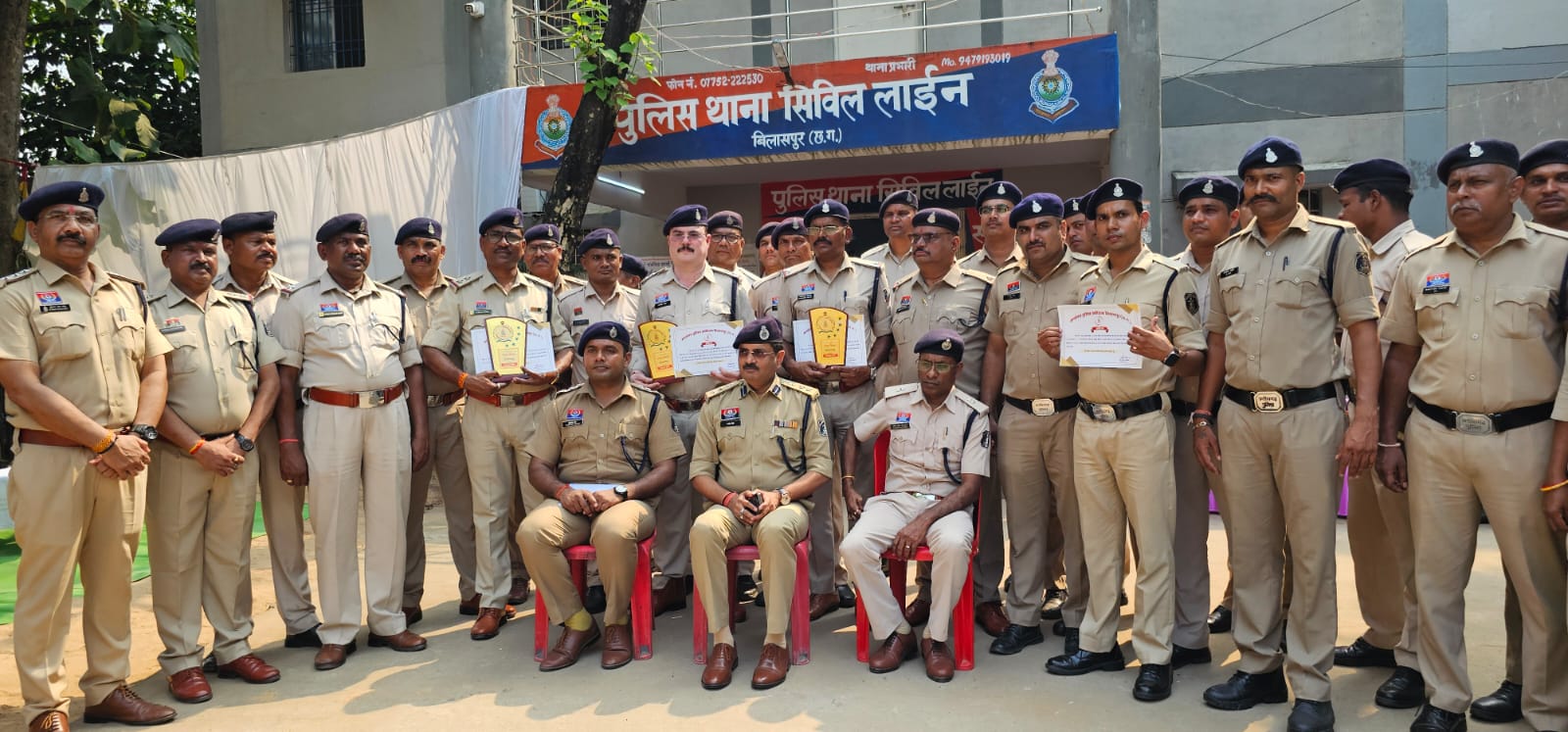 इन प्रकरणों में उत्कृष्ट विवेचना एवं सहयोग करने वाले पुलिस अधिकारी एवं कर्मचारियों—*उपनिरीक्षक अमृत साहू, उपनिरीक्षक अवधेश सिंह, सहायक उपनिरीक्षक चन्द्रकांत डहरिया, सहायक उपनिरीक्षक राजेशधर दीवान, आरक्षक मनोज साहू एवं आरक्षक बृजनंदन साहू*—को वरिष्ठ पुलिस अधीक्षक श्री राजनेश सिंह, बिलासपुर द्वारा थाना सिविल लाइन में स्वयं उपस्थित होकर प्रशस्ति पत्र एवं मोमेंटो प्रदान कर सम्मानित किया गया।