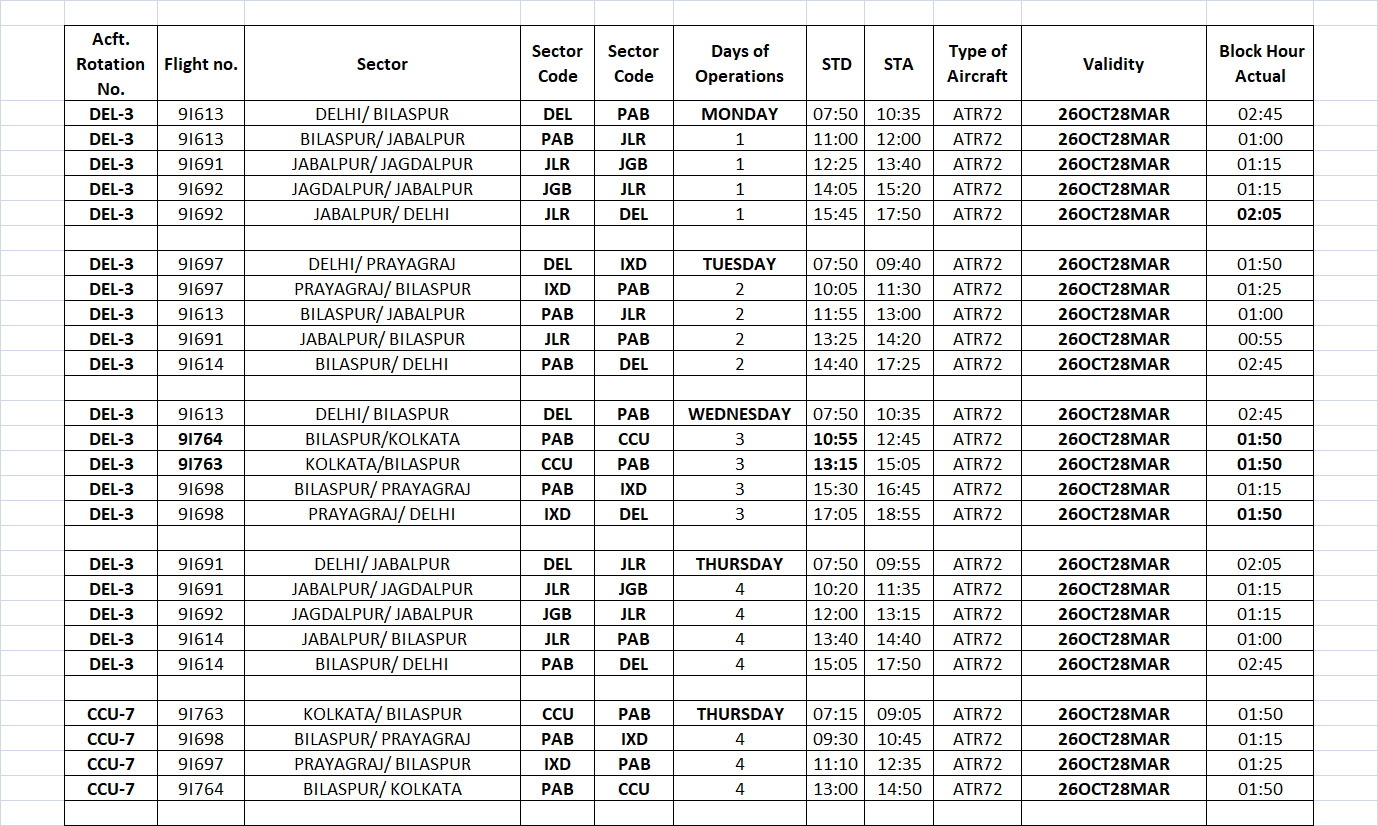 हवाई सुविधा जल संघर्ष समिति ने विंटर शेड्यूल की जानकारी देते हुए बताया कि अब बिलासपुर से दिल्ली के बीच केवल सप्ताह में तीन उड़ान ही उपलब्ध रहेगी जिसमें से एक दिन वह प्रयागराज होकर जाएगी। इसके अलावा बिलासपुर से जबलपुर और प्रयागराज के लिए भी उड़ानों की संख्या में पहले से कभी कर दी गई है। विंटर शेड्यूल को इतनी अजीब तरीके से बनाया गया है कि विमान दिल्ली से बिलासपुर आने के बाद पहले जबलपुर जाएगा और उसके बाद जगदलपुर जाएगा। और लौटते हुए वहां से जगदलपुर से सीधा जबलपुर होते हुए दिल्ली चला जाएगा। समिति रे सवाल उठाया के जबलपुर से जगदलपुर के बीच आखिर कौन यात्री यात्रा करने वाले हैं जिनके लिए यह सीधी उड़ान की सुविधा दी जा रही है। जबलपुर के मुकाबले बिलासपुर से जगदलपुर के बीच उड़ान में यात्री अधिक मिलने की संभावना हमेशा ज्यादा है। जगदलपुर से दिल्ली का संबंध भी वाया बिलासपुर ही होना उचित है ना कि वाया जबलपुर होना।