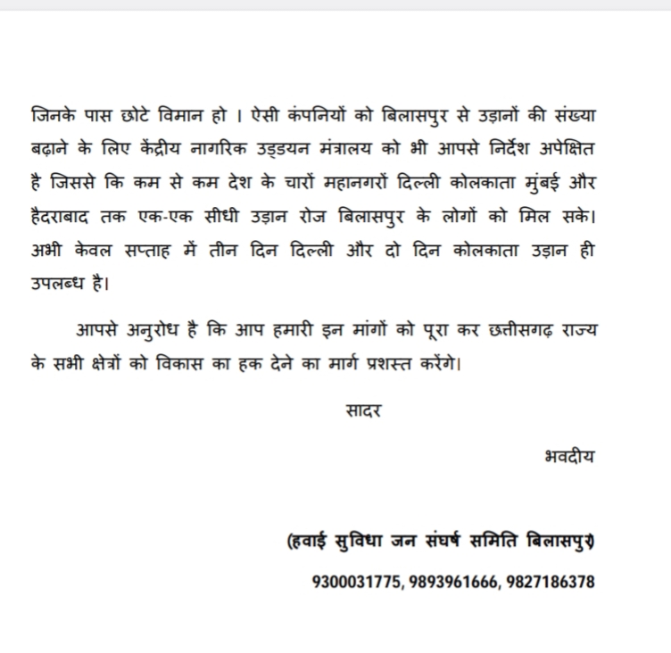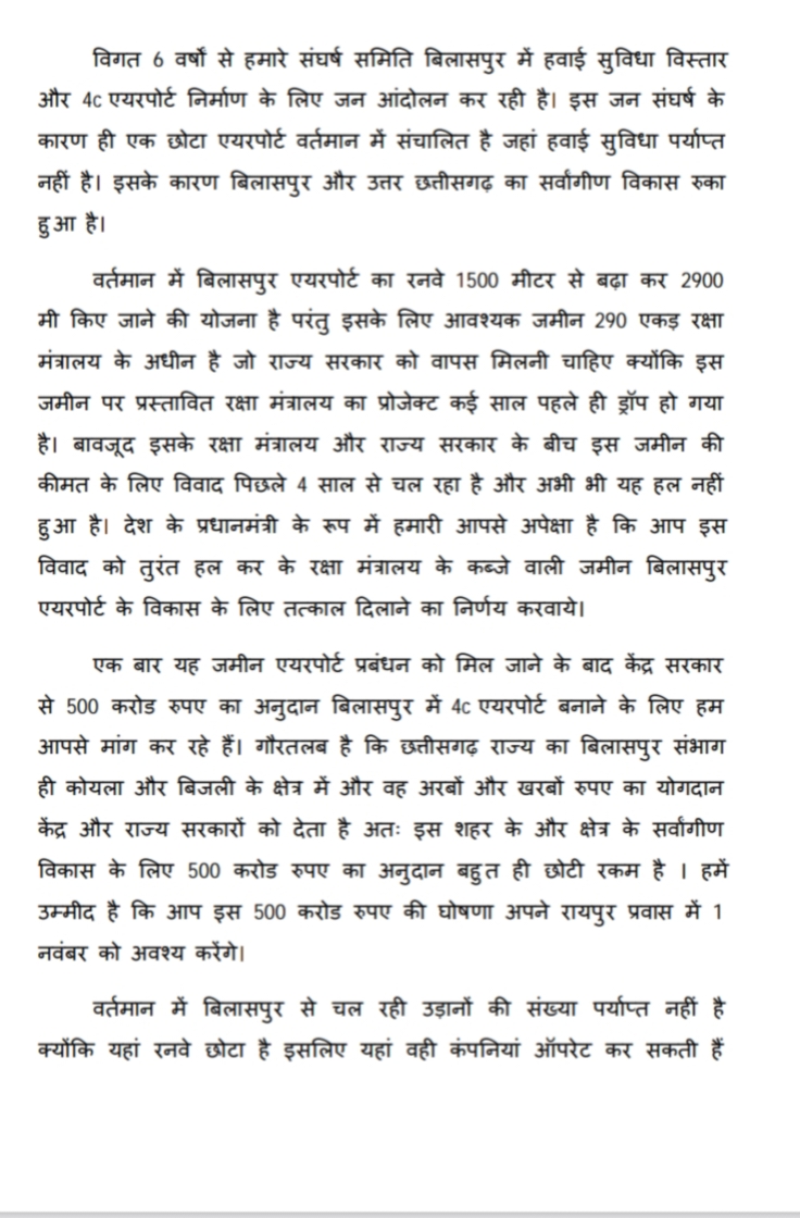 प्रदर्शन के बाद कलेक्टर बिलासपुर के मार्फत प्रधानमंत्री श्री नरेंद्र मोदी को भेजे गए ज्ञापन में कहा गया है कि वह अपने 1 नवंबर को होने वाले छत्तीसगढ़ प्रवास के दौरान बिलासपुर एयरपोर्ट के विस्तार के लिए 290 एकड़ जमीन वापसी और 500 करोड अनुदान की घोषणा करके यह साबित करें कि छत्तीसगढ़ राज्य में बिलासपुर क्षेत्र का भी उतना ही महत्व है। छत्तीसगढ़ राज्य के सर्वांगीण विकास के लिए रायपुर दुर्ग भिलाई क्लस्टर के बाहर भी विकास कार्य होना आवश्यक है और एक 4c एयरपोर्ट शिक्षा स्वास्थ्य उद्योग पर्यटन सभी क्षेत्रों में विकास के द्वार खोलेगा।