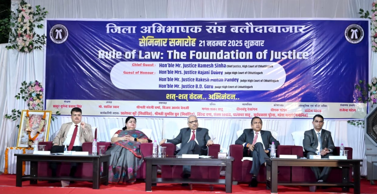 बिलासपुर। जिला न्याय की आधारशिला” न्यायालय परिसर, बलौदाबाजार में “विधि के शासन विषय पर महत्वपूर्ण सेमिनार का आयोजन जिला अधिवक्ता संघ बलौदाबाजार द्वारा शुक्रवार को किया गया । कार्यक्रम में मुख्य अतिथि के रूप में न्यायमूर्ति रमेश सिन्हा मुख्य न्यायाधीश, छत्तीसगढ़ उच्च न्यायालय की उपस्थिति रही। मुख्य न्यायाधिपति ने कार्यक्रम का शुभारंभ दीप प्रज्वलन के साथ किया तथा विषय पर विस्तृत, प्रभावशाली एवं प्रेरणादायी वक्तव्य दिया ।