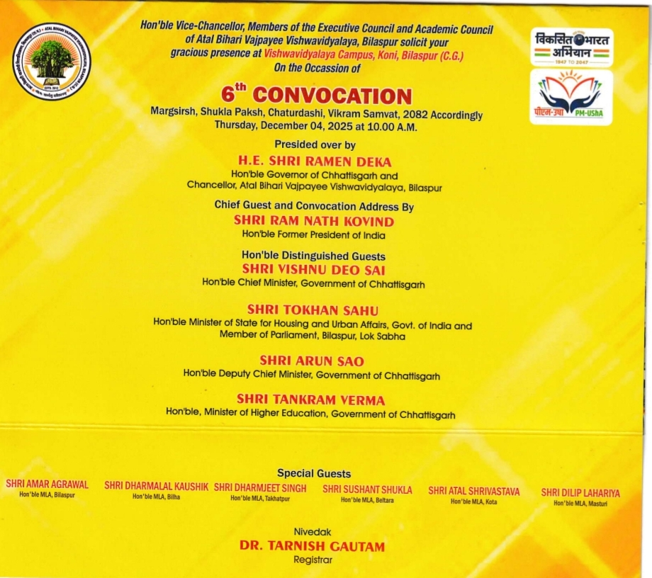 कार्यक्रम के मुख्य अतिथि पूर्व राष्ट्रपति रामनाथ कोविंद कल रात रायपुर पहुंचे और आज सुबह 11 बजे के पहले विश्वविद्यालय पहुंच जाएंगे ।