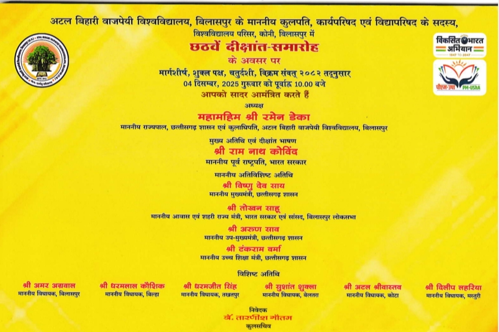 बिलासपुर। आज गुरुवार को आयोजित अटल बिहारी वाजपेयी विश्वविद्यालय, बिलासपुर के छठवें दीक्षांत समारोह के अवसर पर एम.ए. (हिंदी साहित्य) में सर्वोच्च अंक प्राप्त करने वाले विद्यार्थी को भाषाविद् एवं प्रख्यात साहित्यकार डॉ. पालेश्वर प्रसाद शर्मा की पावन स्मृति में स्वर्ण पदक से सम्मानित किया जाएगा।