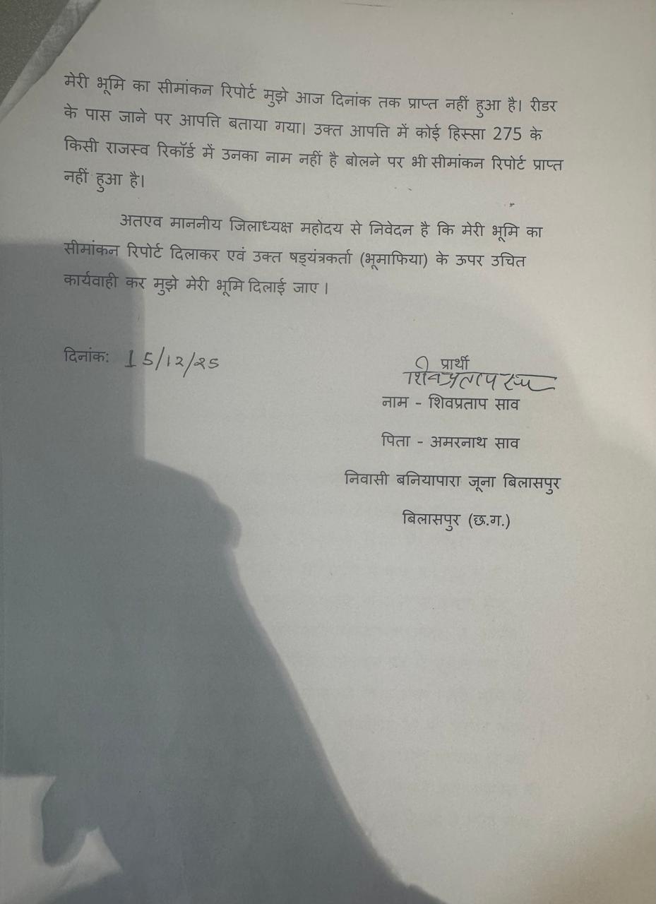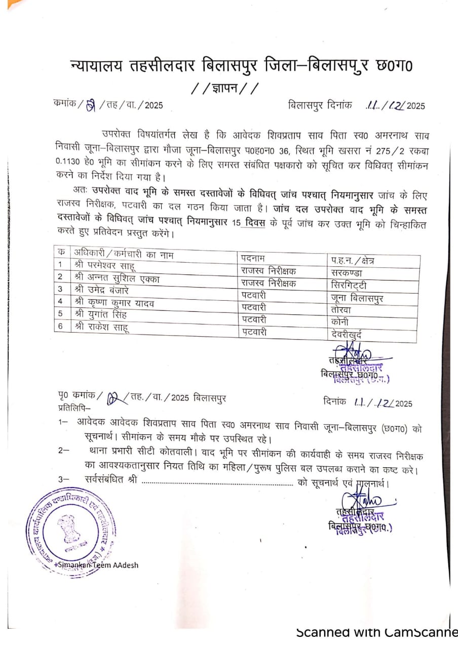 मौजा जूना बिलासपुर हल्का के करबला स्थित खसरा नंबर 275/2 मे रकबा 0.1130 हेक्टेयर भूमि आवेदक शिव प्रताप साव के नाम पर दर्ज है जिसका सीमांकन बीते 15 अक्टूबर 2025 को 7 सदस्यीय आर आई – पटवारी की टीम द्वारा किया गया सीमांकन में चिमन रावलानी द्वारा खसरा नंबर 275 के कुछ हिस्से मे कब्जा करना पाया गया गांधी चौक के पास स्थित चौधरी मोहल्ला के आसपास का खसरा नंबर 277 को चिमन रावलानी चार टुकड़े में रजिस्ट्री कर खसरा नंबर 275 मे काबिज है ।टेंट का व्यवसाय करने वाले चिमन रावलानी द्वारा नगर निगम को भी गलत जानकारी देते हुए बिल्डिंग का नक्शा पास कराना पाया गया ।शासन को धोखे में रखने किए गए अवैधानिक कृत्य की सीमांकन मे पोल खुलता देख चिमन रावलानी तहसील में आपत्ति दर्ज कराने पहुंचा। चिमन रावलानी की रीडर से भेंट के बाद दुसरे खसरा की आपत्ति को तहसीलदार प्रकाश साहू द्वारा सहर्ष दर्ज कर लिया गया। तहसीलदार प्रकाश साहू का सानिध्य पाकर पूर्व सीमांकन रिपोर्ट को दबाना और नया सीमांकन कराकर जमीन को विवादित बनाने की मंशा लेकर चल रहा चिमन रावलानी शुक्रवार 2 जनवरी को हुए सीमांकन में भी मौके पर पहुंची टीम को आपत्ति आवेदन प्रस्तुत किया और बताया कि आज के सीमांकन की जानकारी उन्हें 2 घंटे पूर्व हुई है और उनकी इस सीमांकन में आपत्ति पहले से दर्ज है। बहरहाल खसरा नंबर 275 की नाप जोख में जुटी टीम ने आवेदक की भूमि चिन्हाकिंत करने के लिए मौके पर टेप गिराना शुरू ही किया था कि तहसीलदार का फोन आते ही टीम स्थिर हो गई ।सीमांकन होल्ड करने के उद्देश्य से टीम के कुछ सदस्य अन्य कार्य का हवाला देते हुए मौके से निकल गए चंद मिनट में आधा अधूरा सीमांकन कार्य सम्पादित कर आरआई द्वारा पंचनामा तैयार किया गया टीम सीमांकन की केवल औपचारिकता होने वी खसरा नंबर 275 की भुजा को चारो दिशा से ना नापने पर आवेदक के पुत्र व अन्य ने हस्ताक्षर करने से इनकार कर दिया।