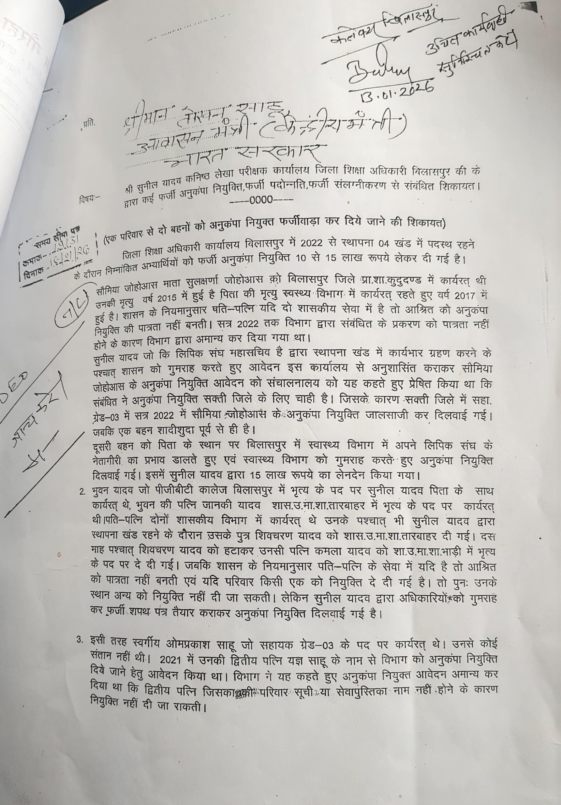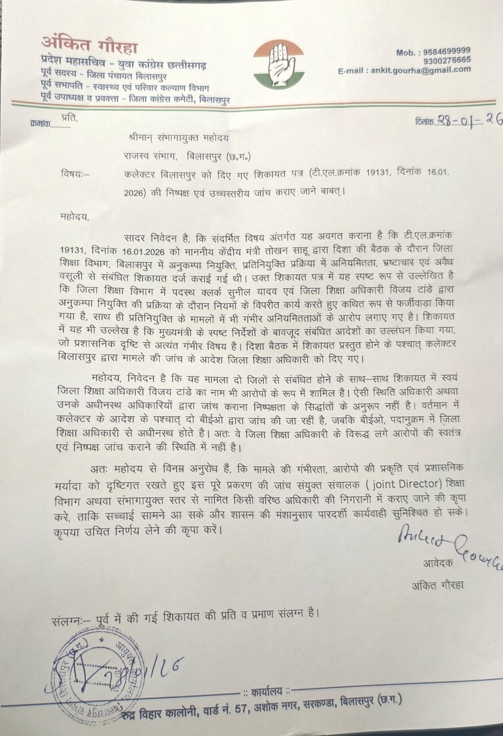 बिलासपुर…शिक्षा विभाग में अनुकंपा नियुक्ति के नाम पर चल रहे कथित खेल ने प्रशासनिक ईमानदारी पर गंभीर सवाल खड़े कर दिए हैं। कांग्रेस नेता अंकित गौराहा ने पूरे मामले को “संगठित भ्रष्टाचार” करार देते हुए कमिश्नर को लिखित शिकायत सौंपी है और साफ कहा है कि यदि जांच ज्वाइंट डायरेक्टर शिक्षा या कमिश्नर स्तर पर नहीं हुई, तो मामला डीपी और सचिव स्तर तक ले जाया जाएगा। जरूरत पड़ी तो आंदोलन और धरना भी होगा।