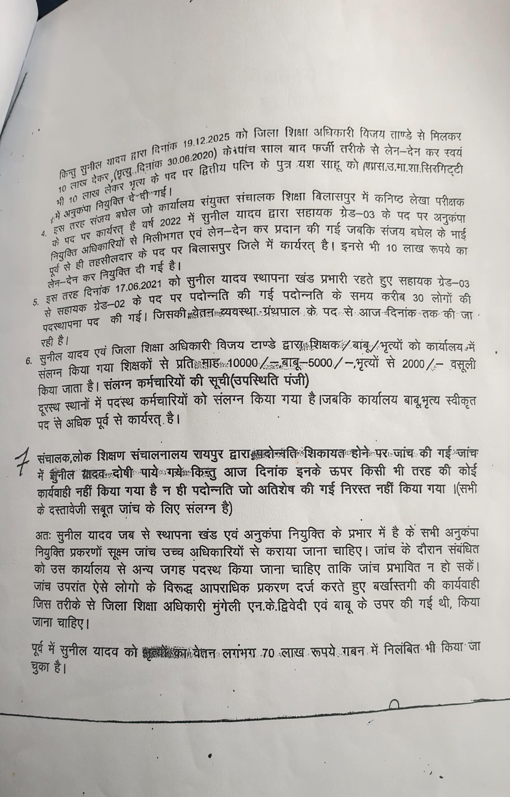 शिकायत के अनुसार यह नियुक्तियां लिपिक सुनील यादव की भूमिका और कथित लेन-देन के बाद कराई गईं। सुनील यादव वर्तमान में स्थापना शाखा से जुड़े कार्यों में प्रभावी भूमिका में पदस्थ बताया गया है, जबकि जिला शिक्षा अधिकारी विजय टांडे उस समय और वर्तमान में भी विभागीय निर्णय प्रक्रिया के शीर्ष पर रहे हैं।