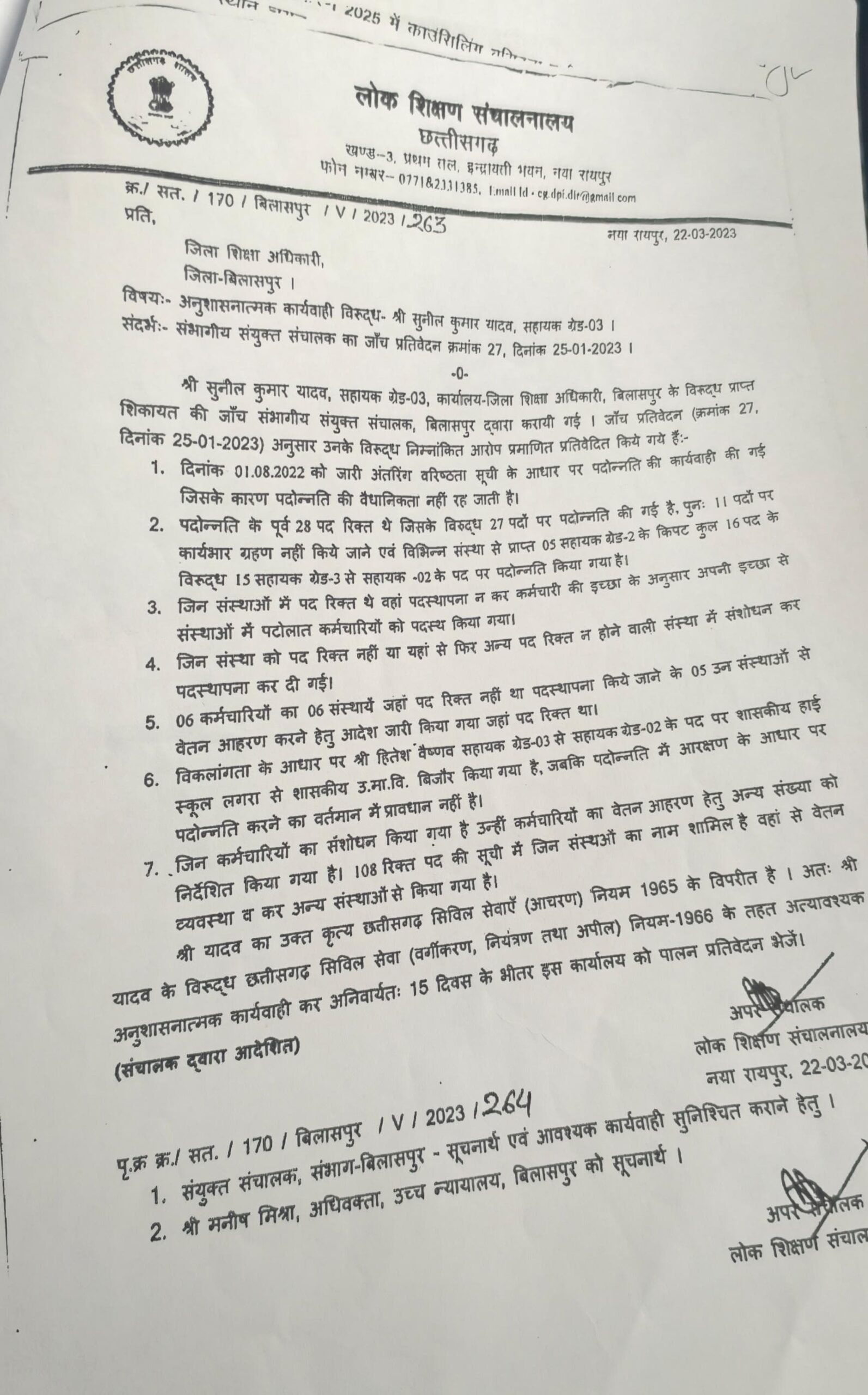 शिकायत में यह भी उल्लेख है कि लोक शिक्षण संचालनालय स्तर पर पूर्व में हुई जांच में सुनील यादव दोषी पाए गए, लेकिन न तो प्रभावी दंडात्मक कार्रवाई हुई और न ही अवैध पदोन्नतियां और नियुक्तियां निरस्त की गईं। अब जबकि शिकायत में जिला शिक्षा अधिकारी विजय टांडे का नाम भी शामिल है, उसी कार्यालय के अधीन खंड शिक्षा अधिकारियों से जांच कराना “जांच को प्रभावित करने जैसा कदम” बताया गया है।