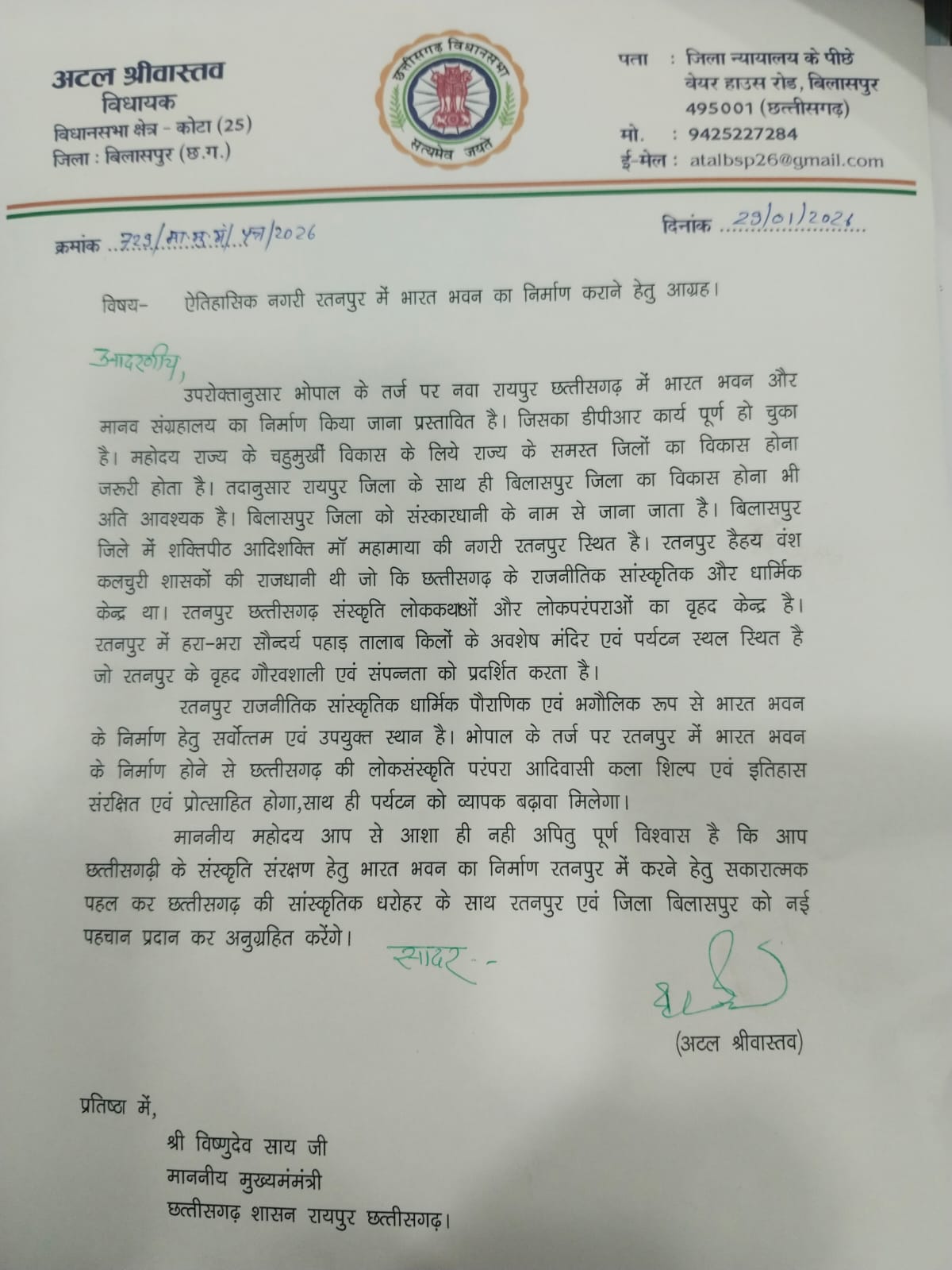 कोटा विधायक ने मुख्यमंत्री को पत्र लिखकर रतनपुर में भारत भवन का निर्माण करने किया आग्रह।