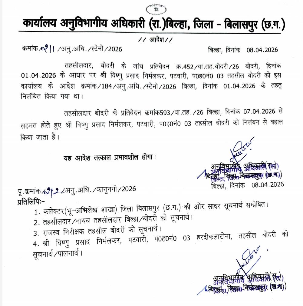 प्राप्त जानकारी के अनुसार, कार्यालय अनुविभागीय अधिकारी (राजस्व) बिल्हा द्वारा 01 अप्रैल 2026 को जारी आदेश के तहत पटवारी विष्णु प्रसाद निर्मलकर (पटवारी हल्का क्रमांक 03, हरदीकला टोना, तहसील बोदरी) को गंभीर अनियमितताओं के आरोप में निलंबित किया गया था। यह कार्रवाई तहसीलदार बोदरी द्वारा प्रस्तुत जांच प्रतिवेदन के आधार पर की गई थी, जिसमें प्रथम दृष्टया आरोप प्रमाणित पाए गए थे।निलंबन आदेश में स्पष्ट किया गया था कि संबंधित पटवारी के विरुद्ध विस्तृत विभागीय जांच की जाएगी और निलंबन अवधि के दौरान उनका मुख्यालय एसडीएम कार्यालय बिल्हा निर्धारित रहेगा हालांकि, घटनाक्रम ने अप्रत्याशित मोड़ तब लिया जब 07 अप्रैल 2026 को प्रस्तुत एक नए जांच प्रतिवेदन के आधार पर 08 अप्रैल 2026 को निलंबन आदेश को निरस्त करते हुए पटवारी को पुनः उनके पूर्व पदस्थापना स्थल पर बहाल कर दिया गया। आदेश में उल्लेख किया गया कि नवीन प्रतिवेदन के अनुसार आरोपों की स्थिति बदलने के कारण यह निर्णय लिया गया।