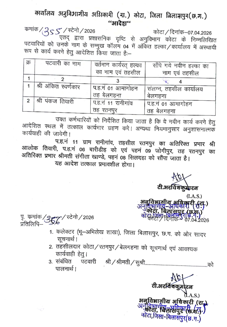 इधर कोटा एसडीएम आईएएस टी अरविंथ कुमारन ने पटवारी अंकित स्वर्णकार को अमागोहन से हटाने का आदेश तो जारी कर दिया लेकिन उनके आदेश का पालन पटवारी ने सप्ताह भर बाद भी नहीं किया इससे यह पता चलता है कि पटवारी या तो अपने उच्च पदस्थ अधिकारी को गंभीरता से नहीं लिया या फिर राजनैतिक पहुंच का तरीका अपनाया है।